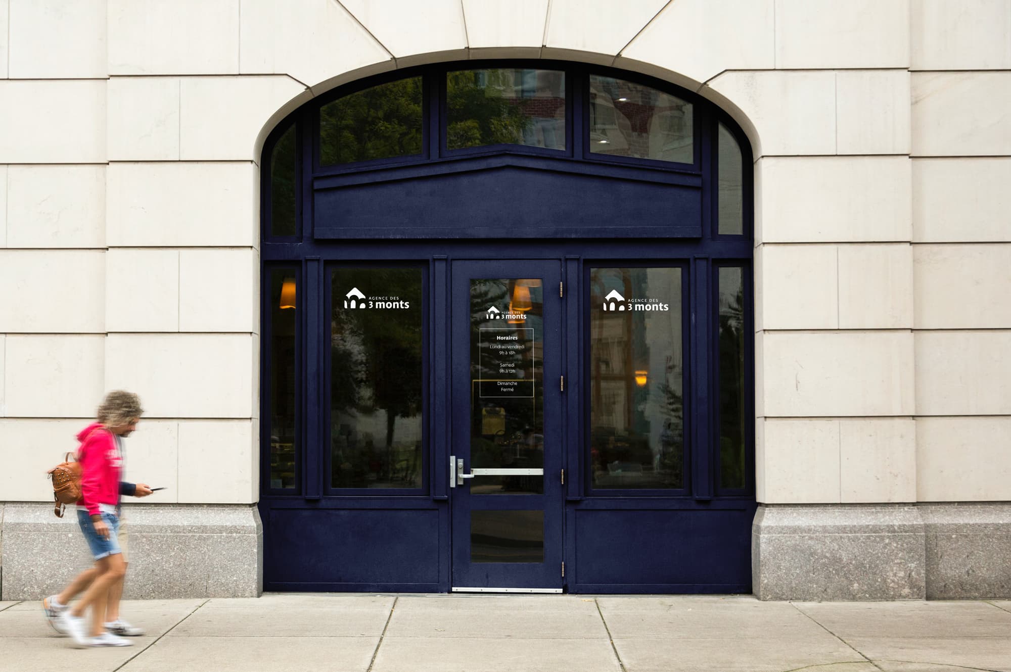 La typographie est ronde et sobre, créant ainsi une ambiance rassurante et accessible. La couleur bleu nuit ajoute une touche premium et qualitative, tout en véhiculant des valeurs de confiance et de sérénité. Le logo représente un symbole de maison, intégrant subtilement le chiffre 3 du nom "3 Monts", pour une identité forte et mémorable.