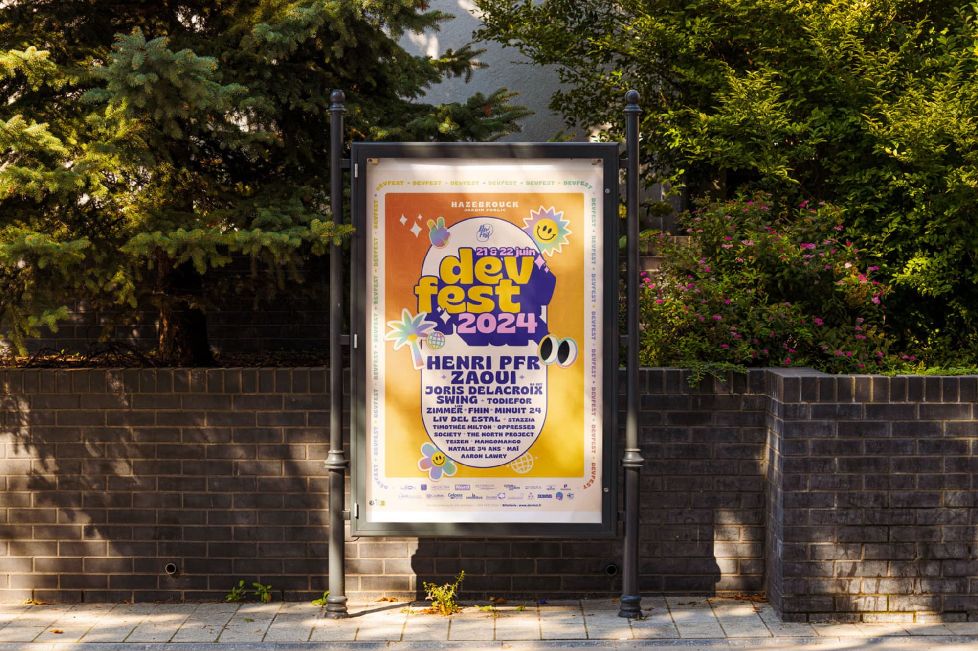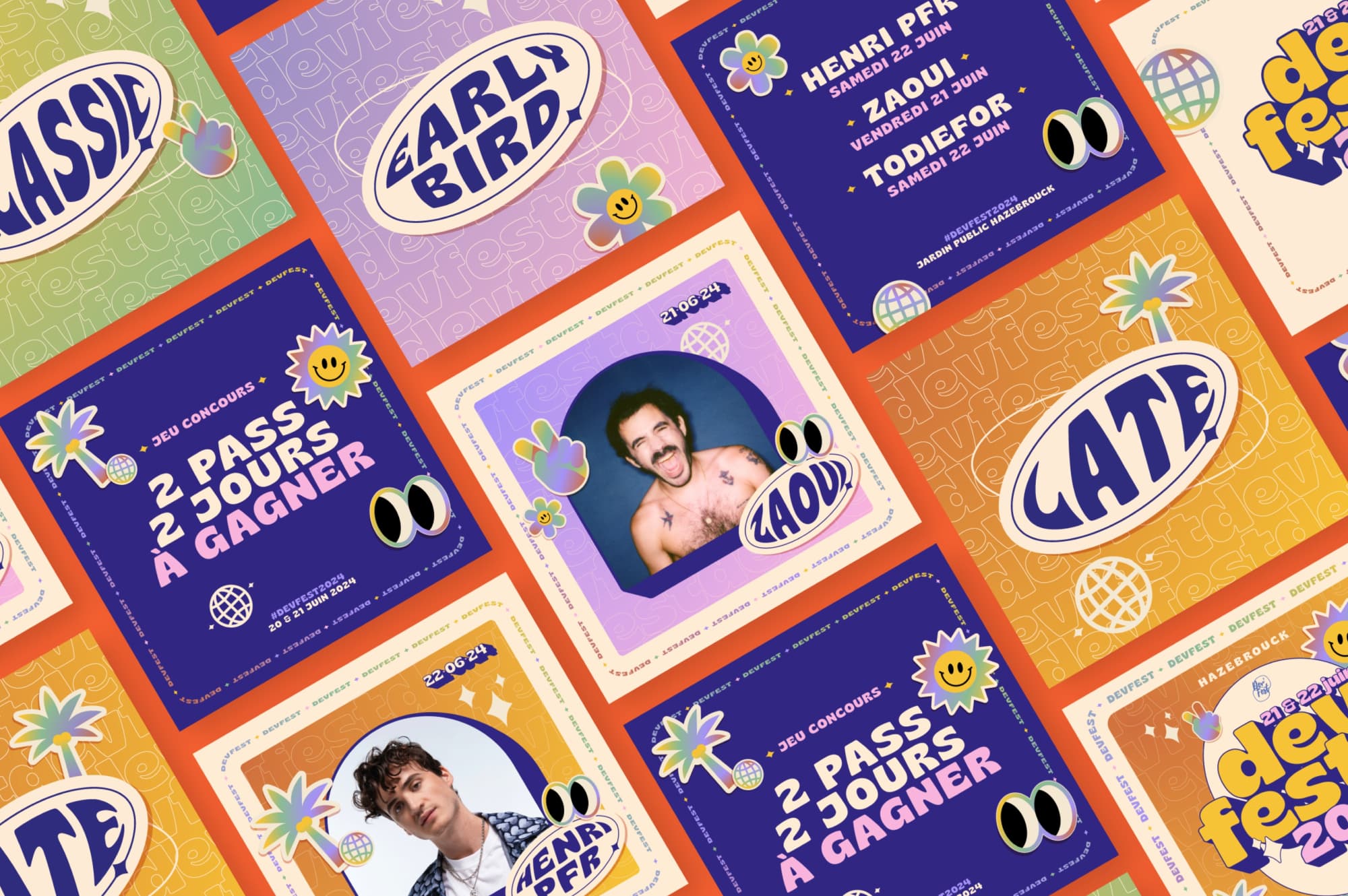 La direction artistique reflète l’esprit estival et convivial du Dev Fest, un événement musical fédérateur. Des couleurs douces et chaleureuses évoquent les soirées d’été, tandis qu’une iconographie ludique et intergénérationnelle souligne son caractère festif et inclusif.