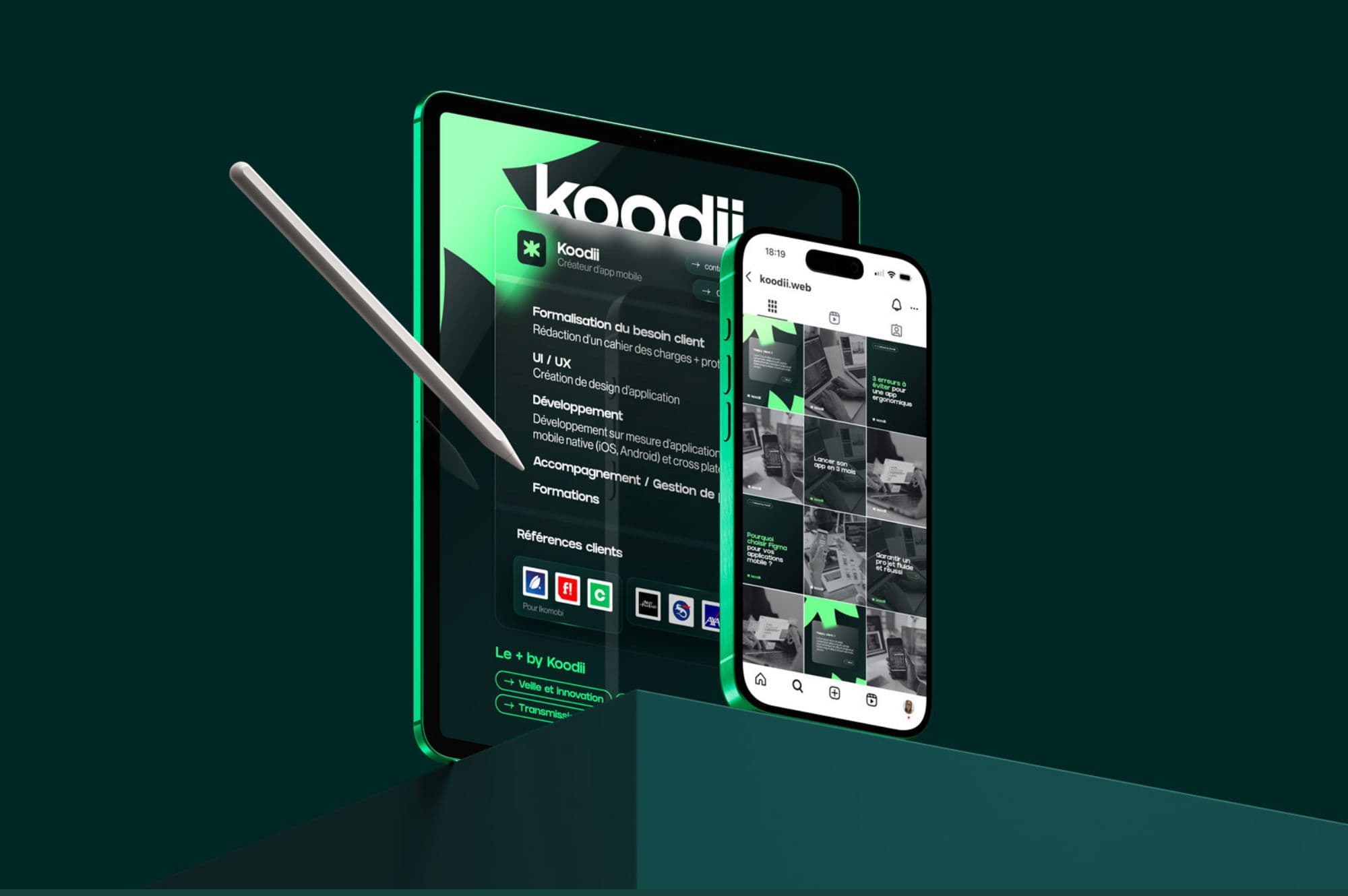 Nous avons accompagné KOODII dans la création de son identité visuelle, en concevant un univers graphique moderne et technologique, adapté à son secteur d’activité et à ses ambitions.